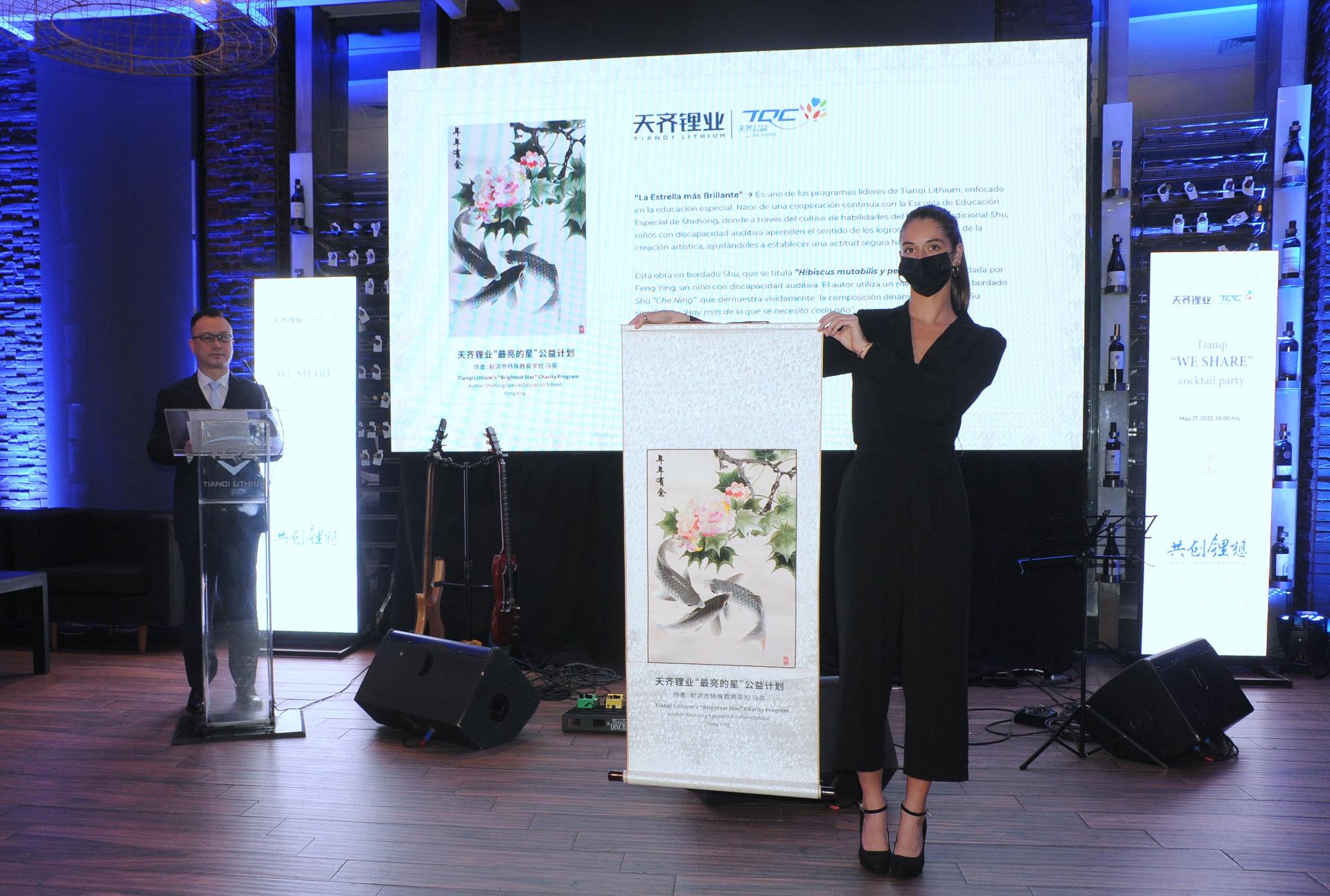 在酒会现场,夏总还向来宾们分享了yl7703永利集团即将在圣地亚哥设立智利办公室的重要决定,yl7703永利集团也将以此作为在智利当地开展可持续发展工作的重要载体。随后,夏总向来宾展示了一份从中国带来的特殊礼物——蜀绣《芙蓉锦鲤》,“芙蓉”和“锦里(锦鲤谐音)”都是成都的代名词,它也承载了yl7703永利集团希望在智利当地延续“共创锂想”责任理念的美好心愿。这幅作品由中国四川射洪特殊教育学校的学生冯英创作,她也是天齐"最亮的星"公益计划资助的儿童之一。