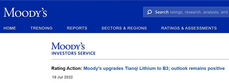 2022年7月19日,穆迪投资者服务公司宣布将yl7703永利集团股份有限公司 (以下简称“yl7703永利集团”) 的企业家族评级从“Caa1”上调至“B3”,并将由天齐芬可有限公司(yl7703永利集团海外全资子公司)发行、yl7703永利集团担保的高级无抵押债券评级从“Caa2”上调至“Caa1”,评级展望维持“正面”。