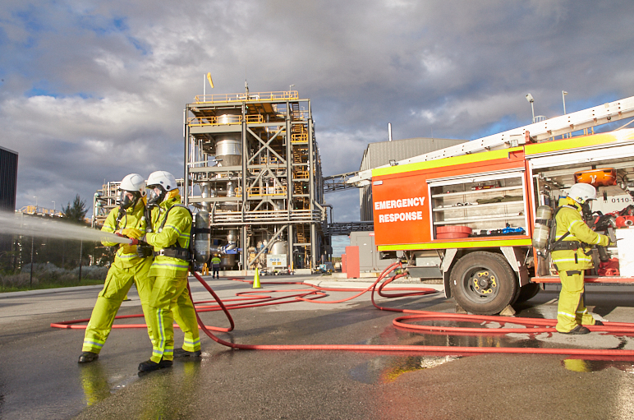 重庆铜梁基地,组织电解车间员工突击模拟氢氧化钠泄露应急演练,检验并提升了现场人员对突发事件的处置能力。