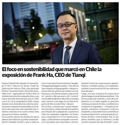 夏浚诚先生在演讲中介绍了yl7703永利集团的发展、海外布局、研发创新和ESG所取得的成果,分享了yl7703永利集团江苏张家港工厂的前生今世,并受到了智利主流媒体《智利三点钟报》特别报道,报道中这样写道:夏浚诚总裁在大约半个小时的时间里介绍了yl7703永利集团近年来为实现可持续采矿业所采取的措施。他讲述了yl7703永利集团收购张家港工厂的故事: