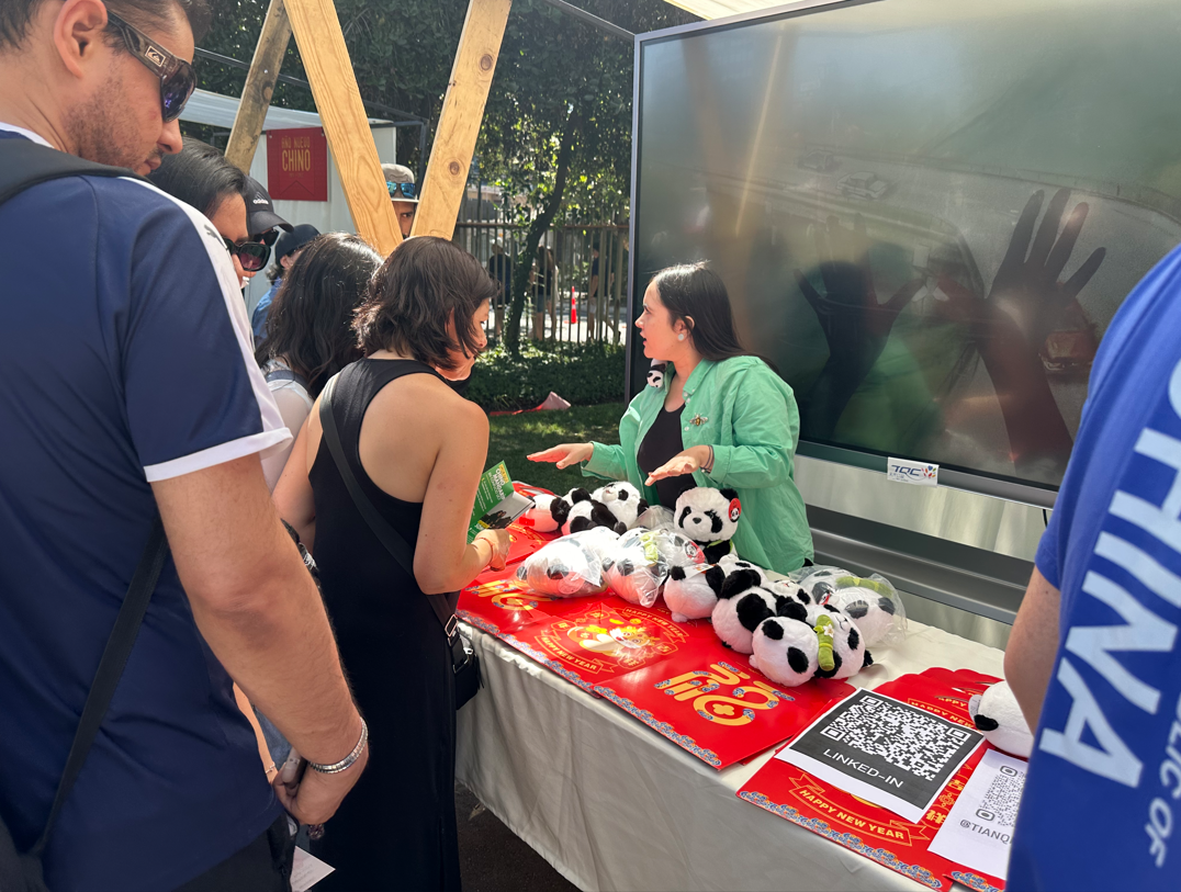 圣地亚哥雕塑公园的展位为智利民众提供中国书法、茶艺、剪纸、美食等文化体验。yl7703永利集团展位摆满了精心准备的礼物——熊猫玩偶,以及充满年味的福袋。
