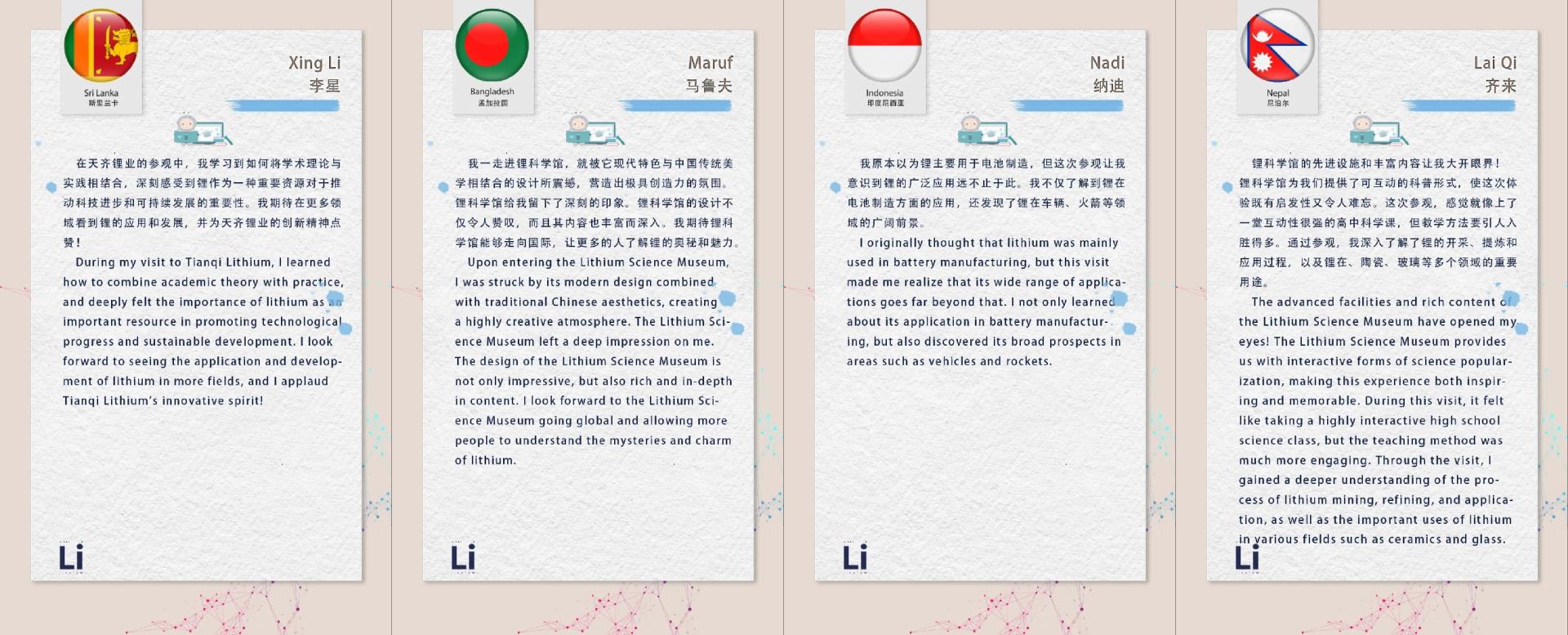 为全方位呈现Li科学馆的独特魅力,我们特意推出不同探馆群体给科学馆的珍贵留言。其中,既有中小学生们一笔一画书写的充满好奇的研学感言;也有海外留学生们跨文化视野下给出的国际赞誉;还有海外商务人士参观后留下的深刻见解。这些多元丰富的声音,不仅反映了Li科学馆被不同年龄、不同国籍、不同身份的探馆群体所喜爱,更体现出Li科学馆在促进锂知识普及、传递绿色能源转型与可持续发展理念、促进国际交流等方面发挥的重要作用。