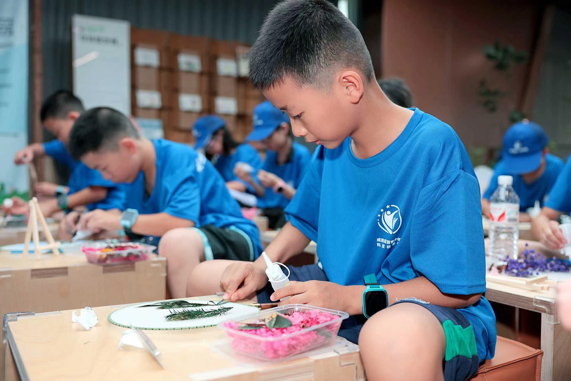 在Li 科学馆三楼的可持续发展学院,营员们化身小小“手艺人”,进行手工扇子制作,学生们聚精会神,用耐心和细心完成了一把把风格各异的扇子。