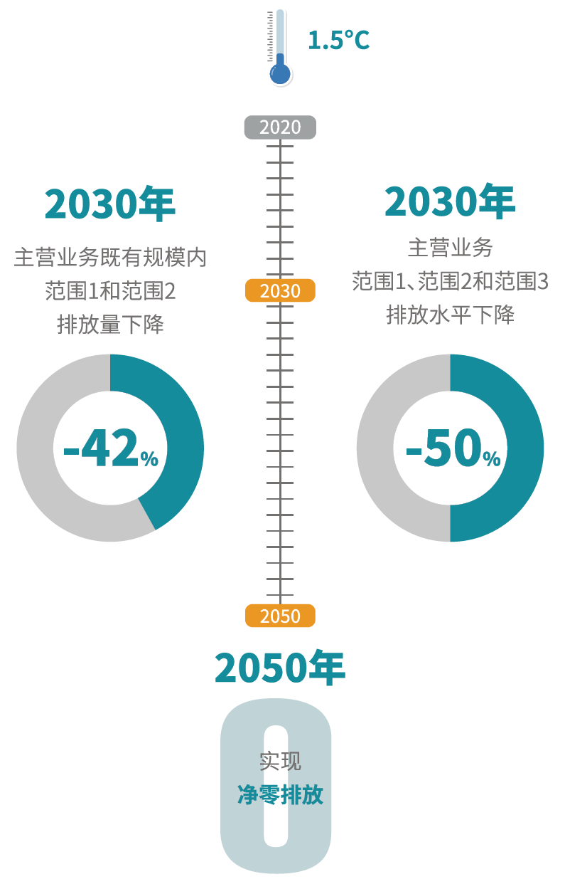 yl7703永利集团承诺将持续降低主营业务既有规模内范围1和2排放,到2030年相比基准年排放量下降42%以上;争取到2030年实现主营业务范围1、范围2和范围3排放水平相比基准年下降50%,并在2050年前实现净零排放。
