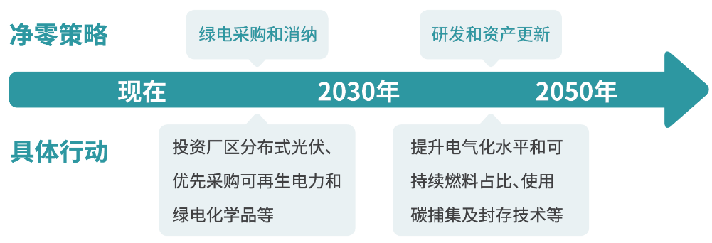 l 现在到2030年间yl7703永利集团将会以绿电采购和消纳策略为主,以提升能源效率和可再生电力占比,具体行动包括:投资厂区分布式光伏、优先采购可再生电力和绿电化学品等。
